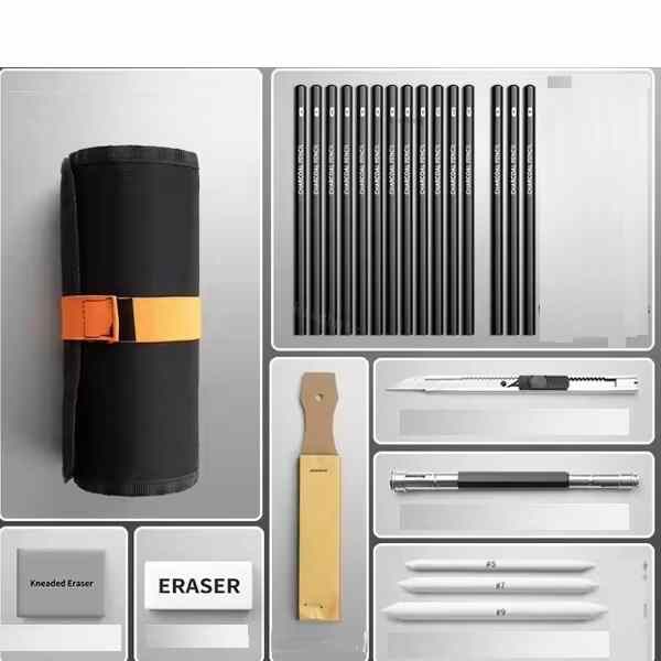 This charcoal art set includes a range of high-quality sketch pencils made from durable wood. The pencils come with a hardness level of 2B, known for its balance between softness and firmness, which allows for versatile drawing. The lead in these pencils ensures smooth and consistent strokes , ideal for shading, sketching, and fine details.